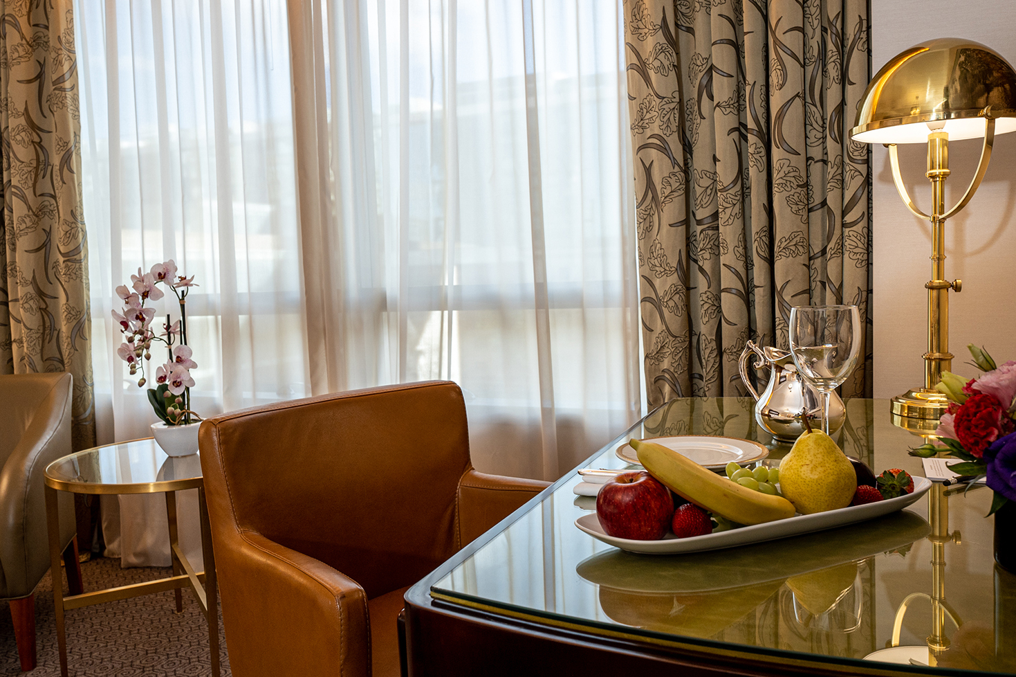 The bright and spacious rooms make up an atmosphere of modern design, equipped with a comfortable desk and an armchair. The luxurious bathrooms are clad in Carrara marble and have a whirlpool tub and separate shower.